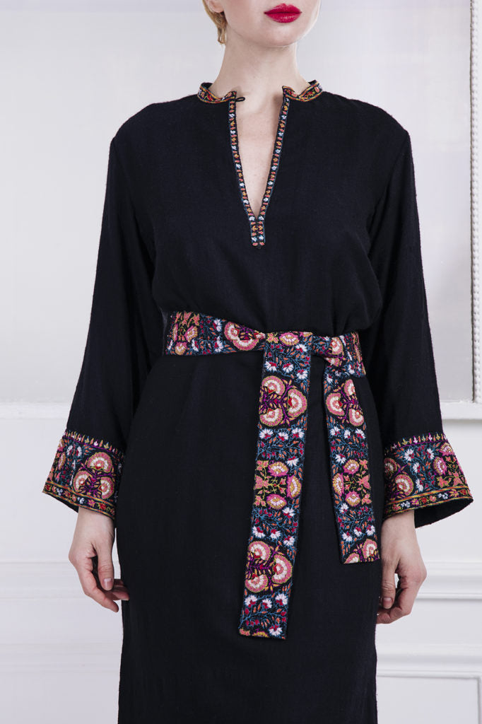 Black Kaftan inspired dress in Pashmina precious wool embellished by a floral patterns embroidered belt of different shades and tones of deep pink and blue.