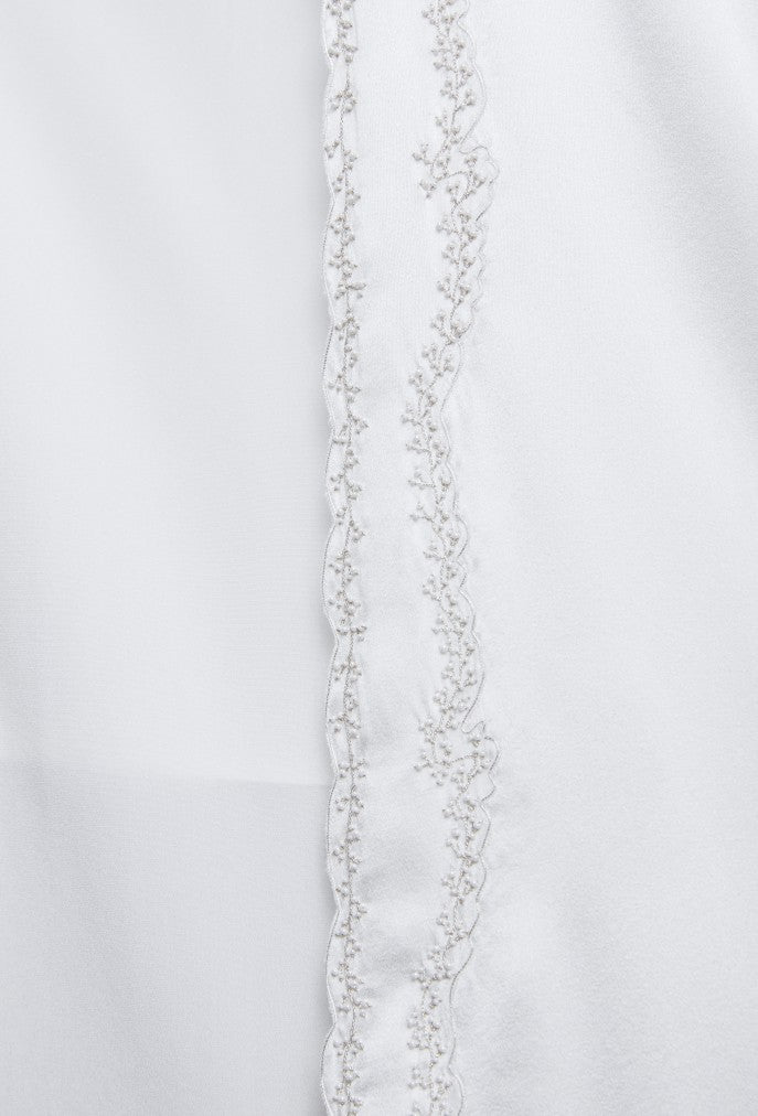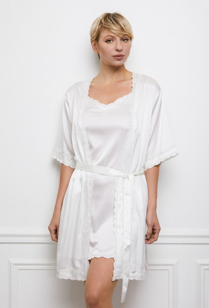 Short Off-white satin silk night robe with the associated belt Embrodery: silver thread and cristal beeds border.