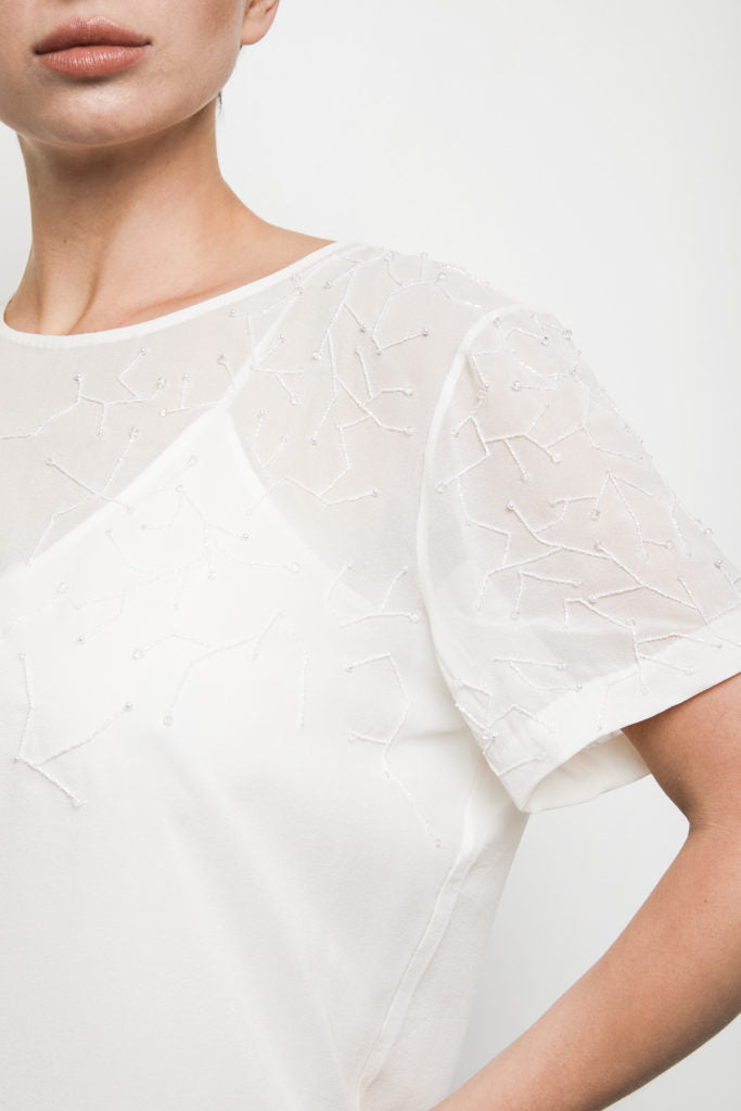 Off-white Top with short sleeves assymetrical embrodery with white pearls and small delicate tubes.