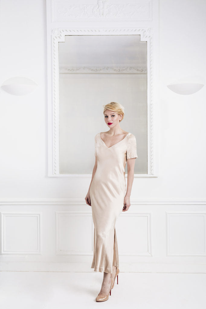 Cut on the bias long needle and thread hand embellished beige satin silk dress.