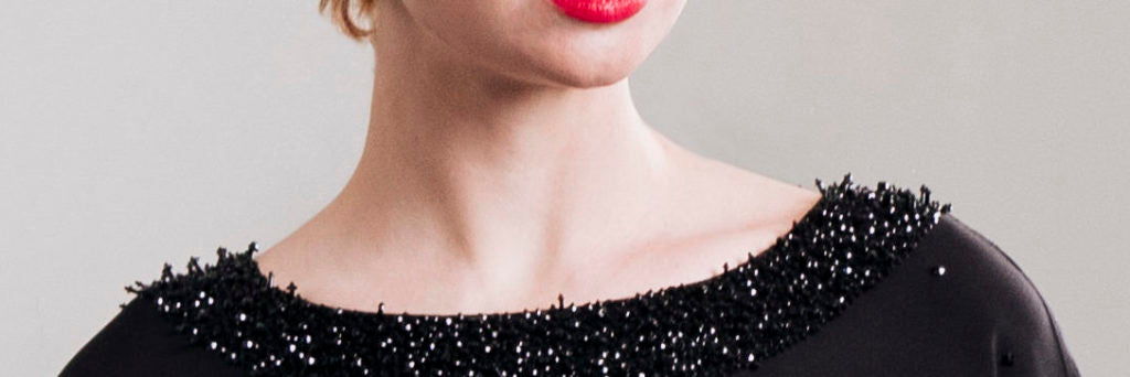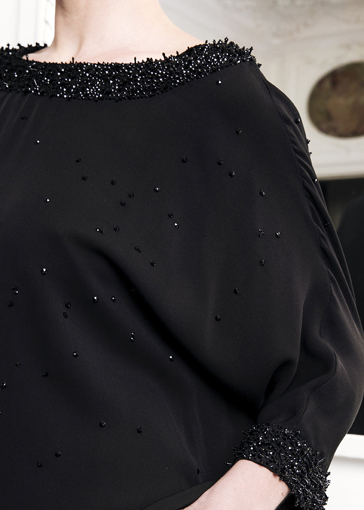 Black gown studded with small precious Swarovski crystals and delicate and elegant embrodery with black Swarovski beads for the neckline and cuffs.