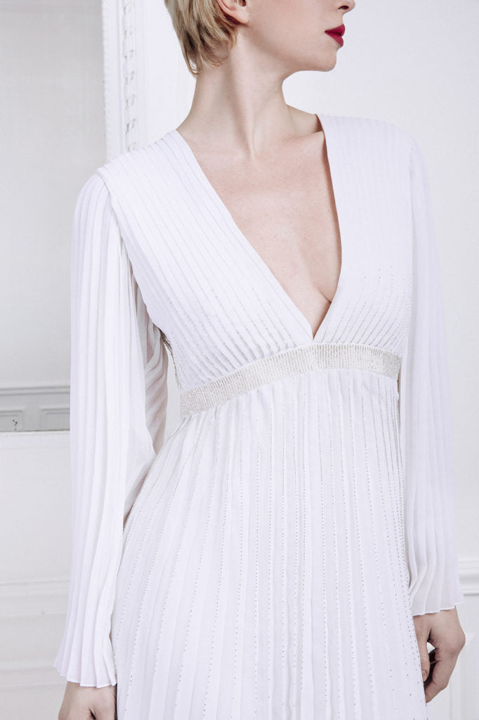 Long dress white silk crepe fully pleated, lined in silk satin.
